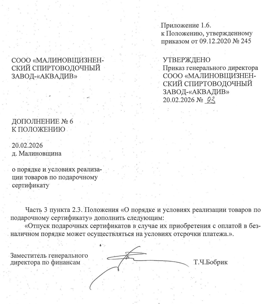 Юридическими лицами, индивидуальными предпринимателями подарочные сертификаты могут быть приобретены у СООО «МАЛИНОВЩИЗНЕНСКИЙ СПИРТОВОДОЧНЫЙ ЗАВОД – «АКВАДИВ» и в порядке безналичных расчетов. Для этого нужно позвонить по телефонам: +375 29 133-73-12; +375 176 50-37-92; выбрать номиналы подарочных сертификатов и определить их количество, адрес доставки; заключить счет-договор; оплатить номинальную стоимость выбранных сертификатов; получить сертификаты по товарной накладной (ТН, ТТН).